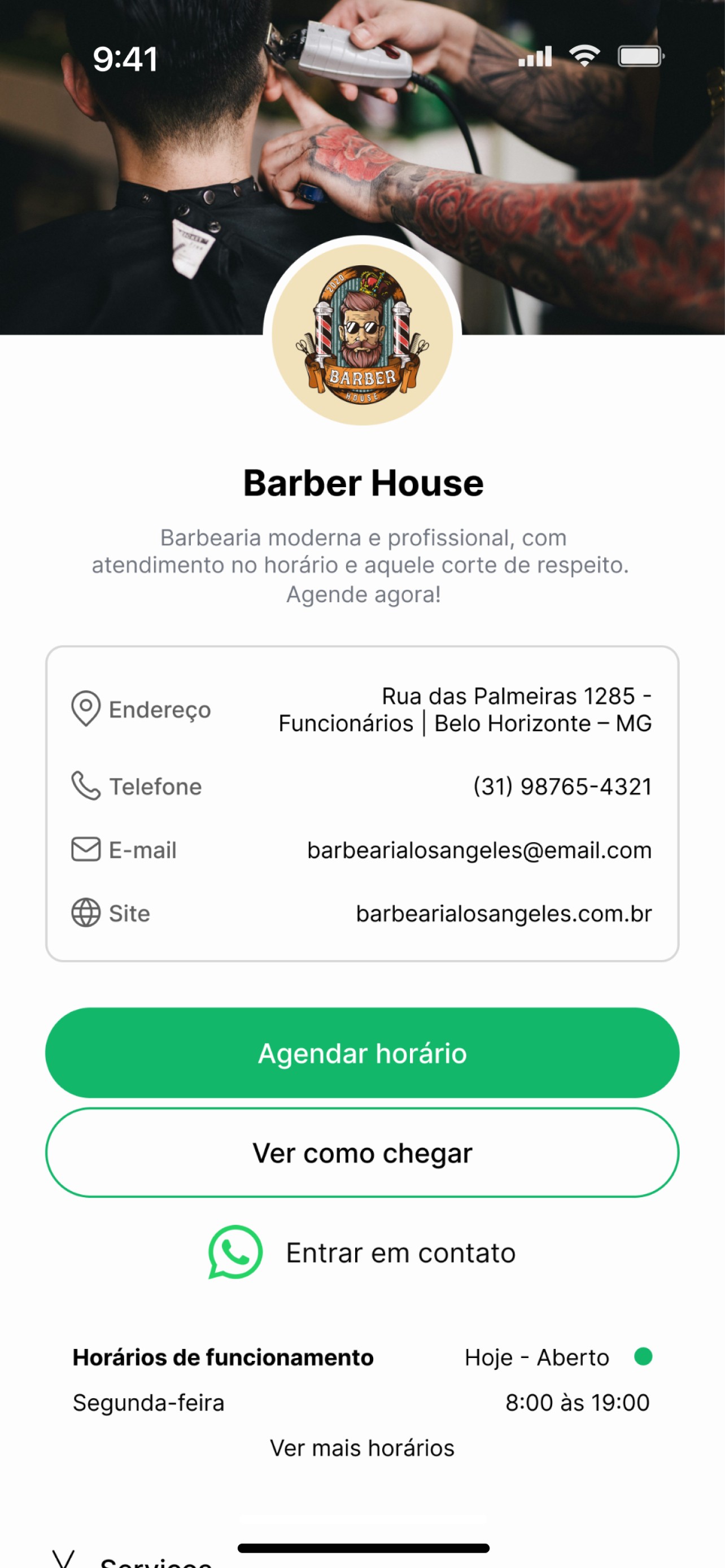 Com seu link exclusivo, o cliente acessa todas as informações da sua barbearia de forma clara e ainda agenda e paga em segundos, sem complicação.