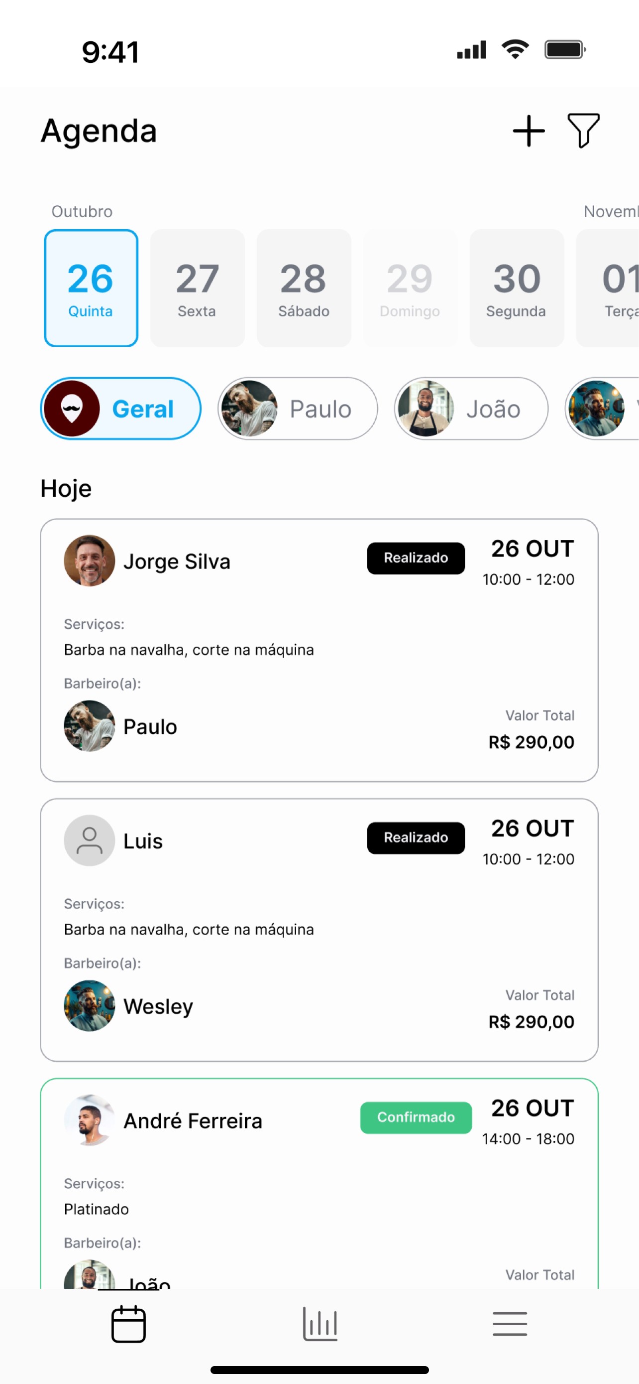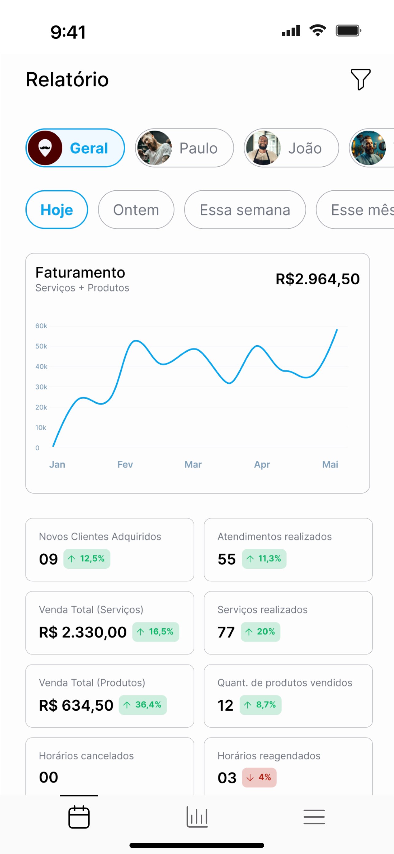 Dentro do app, você descobre quanto entrou no mês, quais serviços venderam mais e quem foram seus melhores clientes. Tudo organizado por barbeiro, por dia ou por produto, do jeito que você quiser ver.